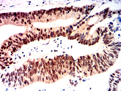 Immunohistochemical analysis of paraffin-embedded human colon cancer tissues using HDAC1 mouse mAb with DAB staining.