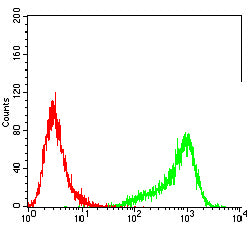 Flow cytometric analysis of K562 cells using MR1 mouse mAb (green) and negative control (red).