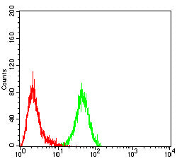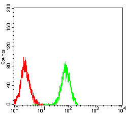 Flow cytometric analysis of THP-1 cells using CDK4 mouse mAb (green) and negative control (red).