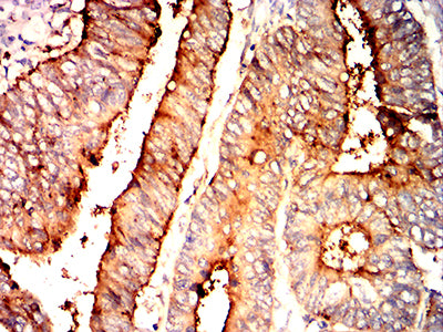 Immunohistochemical analysis of paraffin-embedded human rectum cancer tissues using CEACAM6 mouse mAb with DAB staining.