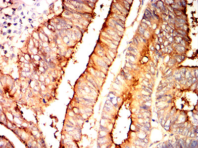Immunohistochemical analysis of paraffin-embedded human rectum cancer tissues using CEACAM6 mouse mAb with DAB staining.