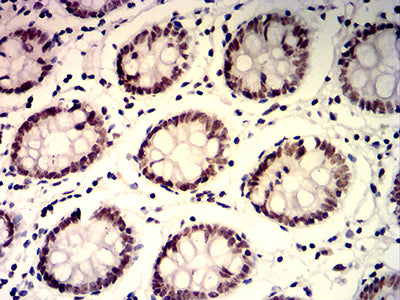 Immunohistochemical analysis of paraffin-embedded human colon tissues using PDLIM7 mouse mAb with DAB staining.