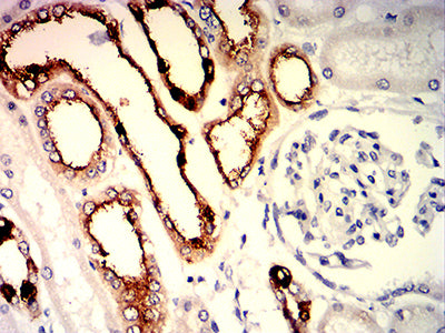 Immunohistochemical analysis of paraffin-embedded human kidney tissues using PDLIM7 mouse mAb with DAB staining.