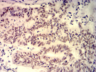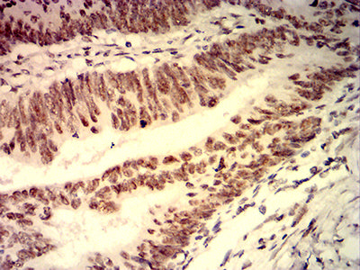 Immunohistochemical analysis of paraffin-embedded human rectum cancer tissues using PDLIM7 mouse mAb with DAB staining.