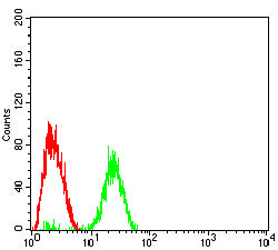 Flow cytometric analysis of Hela cells using BRAF mouse mAb (green) and negative control (red).