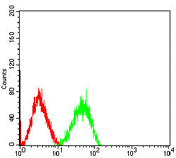 Flow cytometric analysis of Hela cells using PTGS2 mouse mAb (green) and negative control (red).