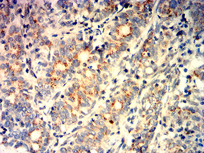 Immunohistochemical analysis of paraffin-embedded human cervical cancer tissues using GOLGA2 mouse mAb with DAB staining.