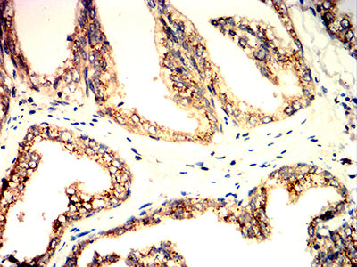 Immunohistochemical analysis of paraffin-embedded human prostate cancer tissues using GOLGA2 mouse mAb with DAB staining.