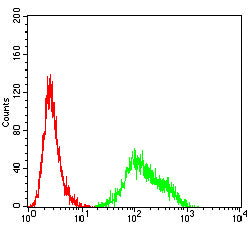 Flow cytometric analysis of THP-1 cells using CD200 mouse mAb (green) and negative control (red).
