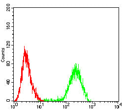 Flow cytometric analysis of Hela cells using NR1H2 mouse mAb (green) and negative control (red).