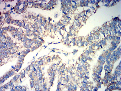 Immunohistochemical analysis of paraffin-embedded human stomach cancer tissues using ATP5F1A mouse mAb with DAB staining.