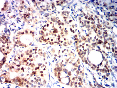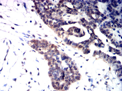 Immunohistochemical analysis of paraffin-embedded human rectal cancer tissues using KMT2A mouse mAb with DAB staining.