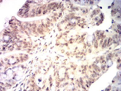 Immunohistochemical analysis of paraffin-embedded human colon cancer tissues using KMT2A mouse mAb with DAB staining.