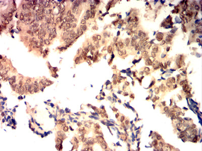 Immunohistochemical analysis of paraffin-embedded human rectal cancer tissues using HSP70 mouse mAb with DAB staining.