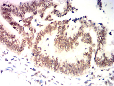 Immunohistochemical analysis of paraffin-embedded human rectal cancer tissues using Jurkat mouse mAb with DAB staining.