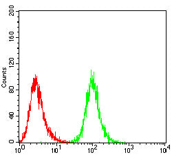 Flow cytometric analysis of HepG2 cells using ETFA mouse mAb (green) and negative control (red).