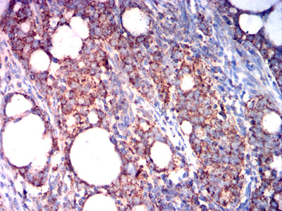 Immunohistochemical analysis of paraffin-embedded human cervical carcinoma tissues using ETFA mouse mAb with DAB staining.