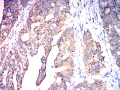 Immunohistochemical analysis of paraffin-embedded human rectal cancer tissues using ETFA mouse mAb with DAB staining.