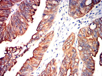 Immunohistochemical analysis of paraffin-embedded human rectal cancer tissues using NDC80 mouse mAb with DAB staining.