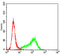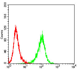 Flow cytometric analysis of Jurkat cells using NDC80 mouse mAb (green) and negative control (red).