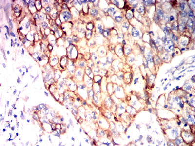 Immunohistochemical analysis of paraffin-embedded human cervical carcinoma tissues using NDC80 mouse mAb with DAB staining.