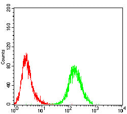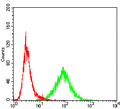 Flow cytometric analysis of K562 cells using USP7 mouse mAb (green) and negative control (red).
