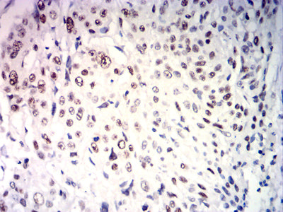 Immunohistochemical analysis of paraffin-embedded human esophageal carcinoma tissues using USP7 mouse mAb with DAB staining.