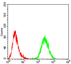 Flow cytometric analysis of Hela cells using P4HB mouse mAb (green) and negative control (red).