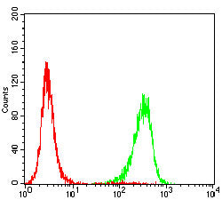 Flow cytometric analysis of Hela cells using P4HB mouse mAb (green) and negative control (red).