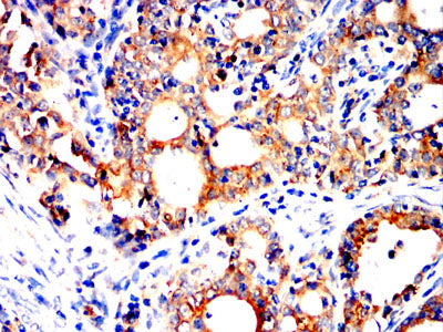 Immunohistochemical analysis of paraffin-embedded human lung cancer tissues using P4HB mouse mAb with DAB staining.