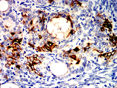 Immunohistochemical analysis of paraffin-embedded human cervical cancer tissues using ALPG mouse mAb with DAB staining.