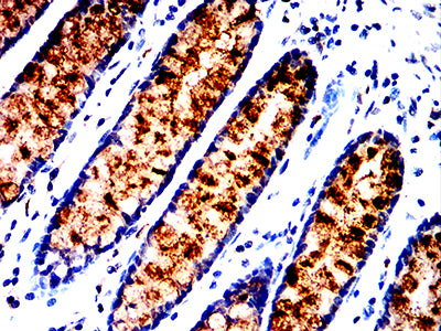 Immunohistochemical analysis of paraffin-embedded human rectum cancer tissues using ALPG mouse mAb with DAB staining.