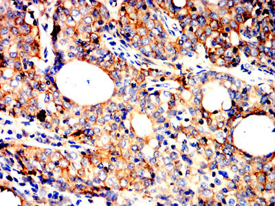 Immunohistochemical analysis of paraffin-embedded human bladder cancer tissues using AHNAK mouse mAb with DAB staining.