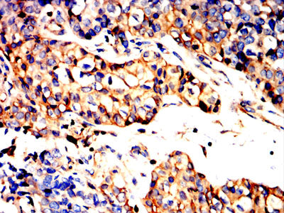 Immunohistochemical analysis of paraffin-embedded human Cervical cancer tissues using AHNAK mouse mAb with DAB staining.