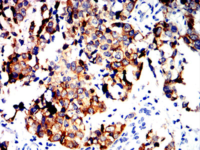 Immunohistochemical analysis of paraffin-embedded human bladder cancer tissues using ALDH1L1 mouse mAb with DAB staining.