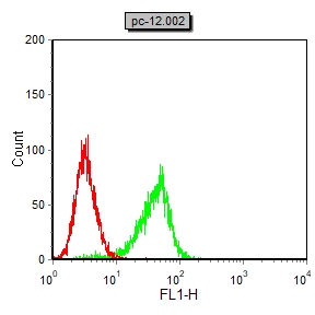 Flow cytometric analysis of PC-12 cells using MAPK11 mouse mAb (green) and negative control (red).