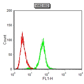 Flow cytometric analysis of K652 cells using MAPK11 mouse mAb (green) and negative control (red).