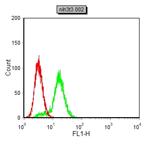 Flow cytometric analysis of NIH3T3 cells using MAPK11 mouse mAb (green) and negative control (red).