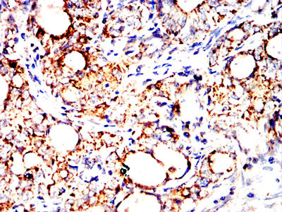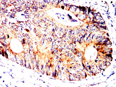 Immunohistochemical analysis of paraffin-embedded human rectal cancer tissues using DLL3 mouse mAb with DAB staining.