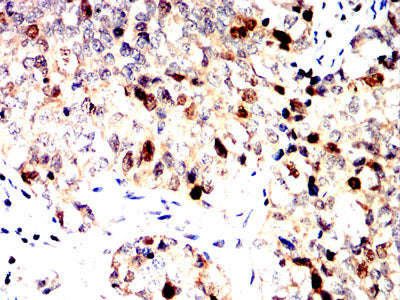 Immunohistochemical analysis of paraffin-embedded human bladder cancer tissues using GMNN mouse mAb with DAB staining.