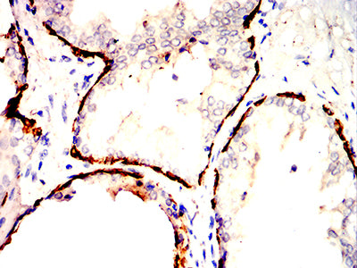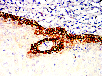 Immunohistochemical analysis of paraffin-embedded human prostatic cancer tissues using KRT14 mouse mAb with DAB staining.