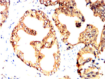Immunohistochemical analysis of paraffin-embedded human prostate cancer tissues using PARK7 mouse mAb with DAB staining.