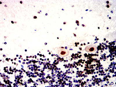 Immunohistochemical analysis of paraffin-embedded human cerebellum tissues using RBMXL3 mouse mAb with DAB staining.