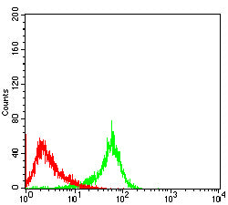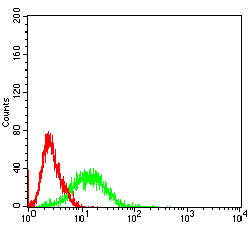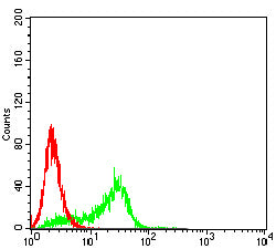 Flow cytometric analysis of Hela cells using CD156B mouse mAb (green) and negative control (red).