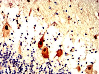 Immunohistochemical analysis of paraffin-embedded human cerebellum tissues using RAD23B mouse mAb with DAB staining.