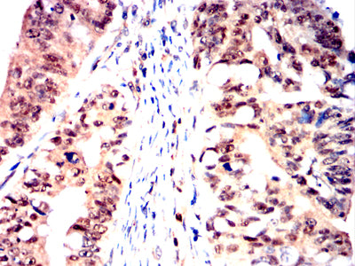 Immunohistochemical analysis of paraffin-embedded human rectum cancer tissues using NPM3 mouse mAb with DAB staining.