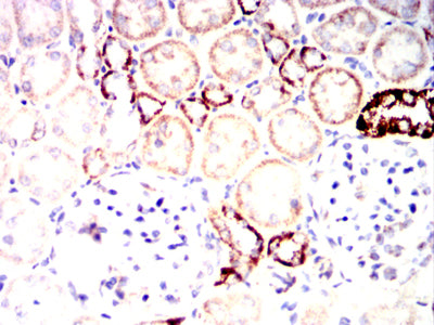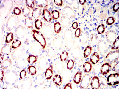 Immunohistochemical analysis of paraffin-embedded rat kidney tissues using IRF3 mouse mAb with DAB staining.