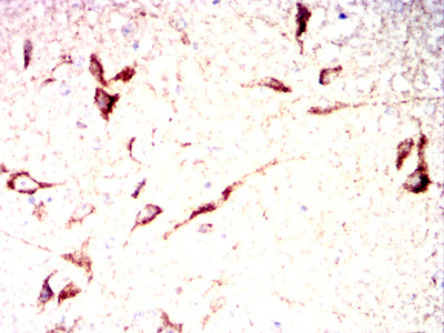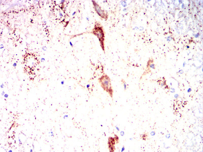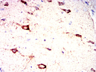 Immunohistochemical analysis of paraffin-embedded rabbit brain tissues using IRF3 mouse mAb with DAB staining.