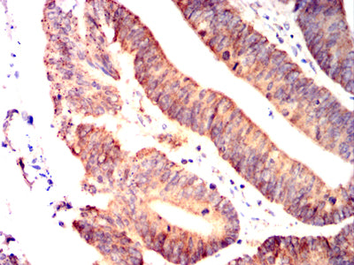 Immunohistochemical analysis of paraffin-embedded human colon cancer tissues using IRF3 mouse mAb with DAB staining.