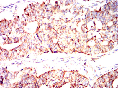 Immunohistochemical analysis of paraffin-embedded human rectum cancer tissues using IRF3 mouse mAb with DAB staining.